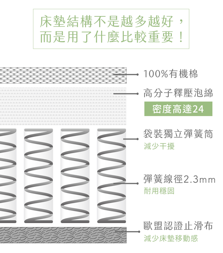 床面是絲質透氣層+100%純天然好棉表布,貼近肌膚時是柔軟又不悶的清爽觸感,相當符合臺灣潮濕又悶熱的氣候,床底則選用科技止滑布,放在床架上不會滑動或位移,整體外型乾淨俐落,不花俏但耐看,放在房間裡就是舒服的存在。尺寸從單人、雙人、雙人加大3種選擇,很推薦給小資族或喜歡軟硬適中睡感、重視透氣與天然材質的人。